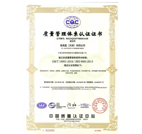 多年來,泰奧星堅(jiān)持質(zhì)量至上的經(jīng)營理念,先后通過了ISO9001質(zhì)量管理體系、ISO14001環(huán)境管理體系和、OHSAS18001職業(yè)健康安全管理體系及IATF16949質(zhì)量管理體系四大體系認(rèn)證。嚴(yán)格的質(zhì)量控制體系保障了公司產(chǎn)品質(zhì)量穩(wěn)定優(yōu)良,近年來,泰奧星先后被認(rèn)定為CMMC中國潤滑材料行業(yè)十強(qiáng)、全國潤滑十佳企業(yè)、中國綠色低碳先鋒企業(yè)等。