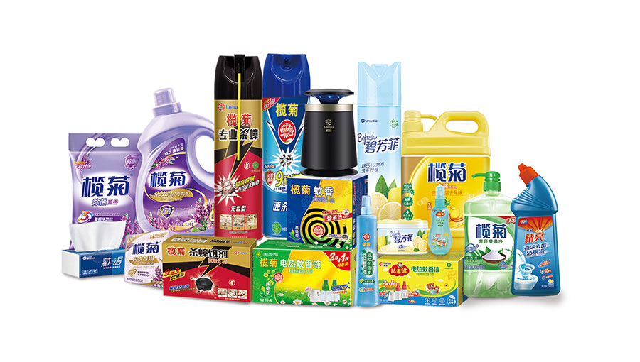 主要產(chǎn)品:欖菊盤式蚊香、電熱蚊香液、驅(qū)蚊液、電熱蚊香片、電蚊香加熱器、殺蟲氣霧劑、殺蟑餌劑、滅蚊燈、電蚊拍、洗衣液、洗潔精、洗衣粉、洗衣皂、洗手液、84消毒液、潔廁精(液)、花露水、空氣清新劑、清香凝膠、生活用紙等
