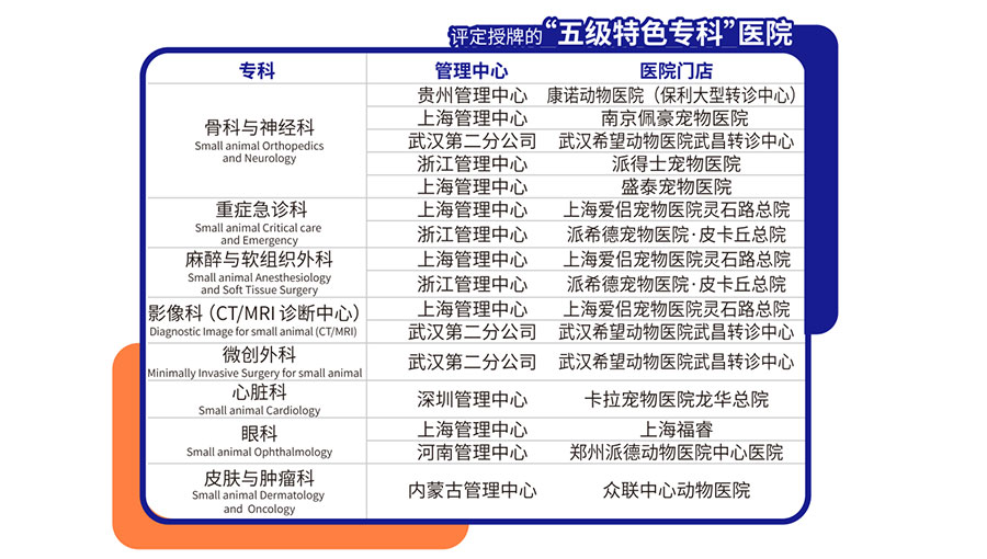 為合理利用醫(yī)療資源,提高醫(yī)院科學(xué)管理水平與醫(yī)療服務(wù)質(zhì)量,保障伴侶動物的健康,集團進一步調(diào)整與健全三級醫(yī)療預(yù)防體系,建立醫(yī)院評審制度,根據(jù)醫(yī)院的功能定位、診療任務(wù)、設(shè)施條件、學(xué)科發(fā)展建設(shè)、醫(yī)療服務(wù)質(zhì)量和科學(xué)管理等方面的綜合水平,對集團內(nèi)所有醫(yī)院進行科學(xué)分級管理。