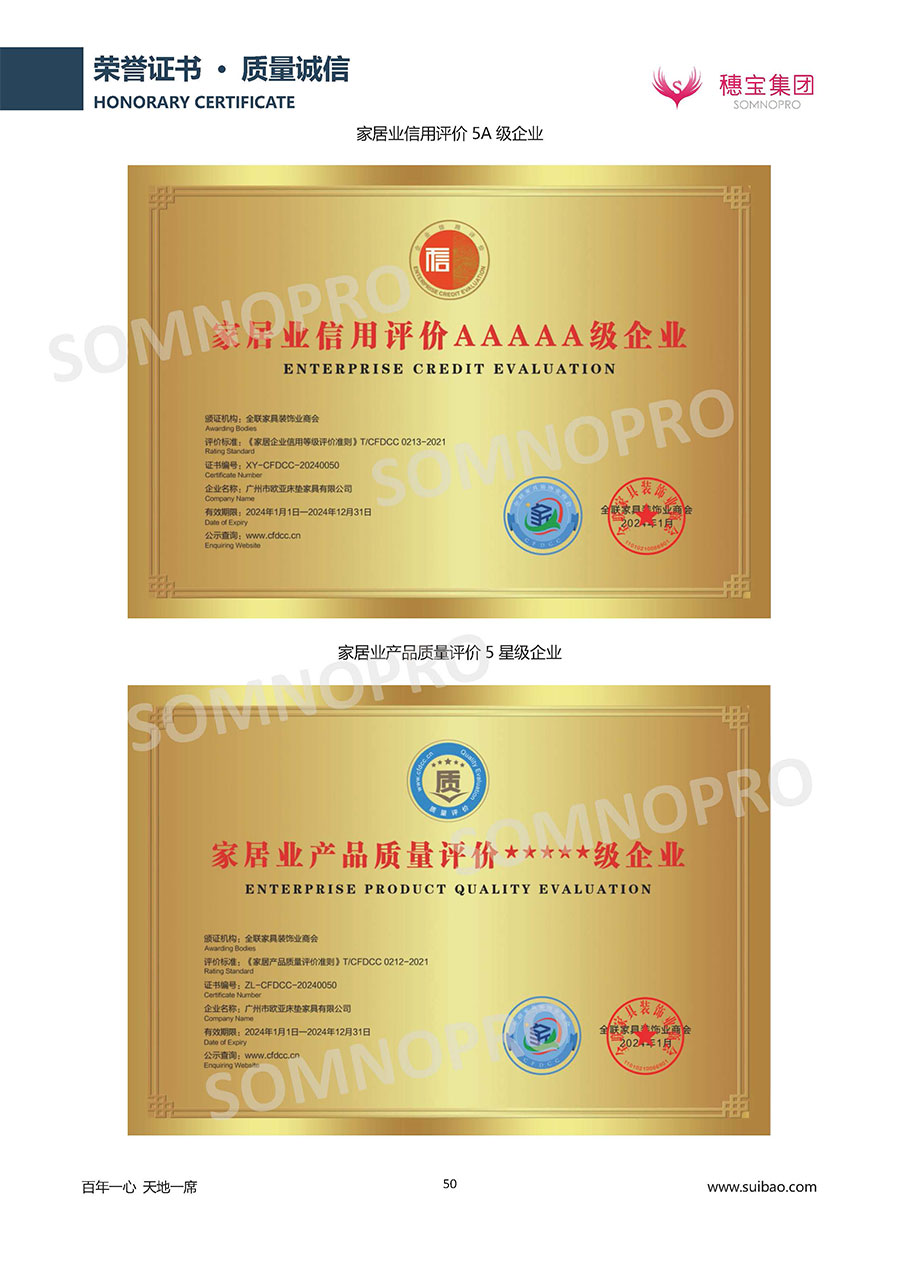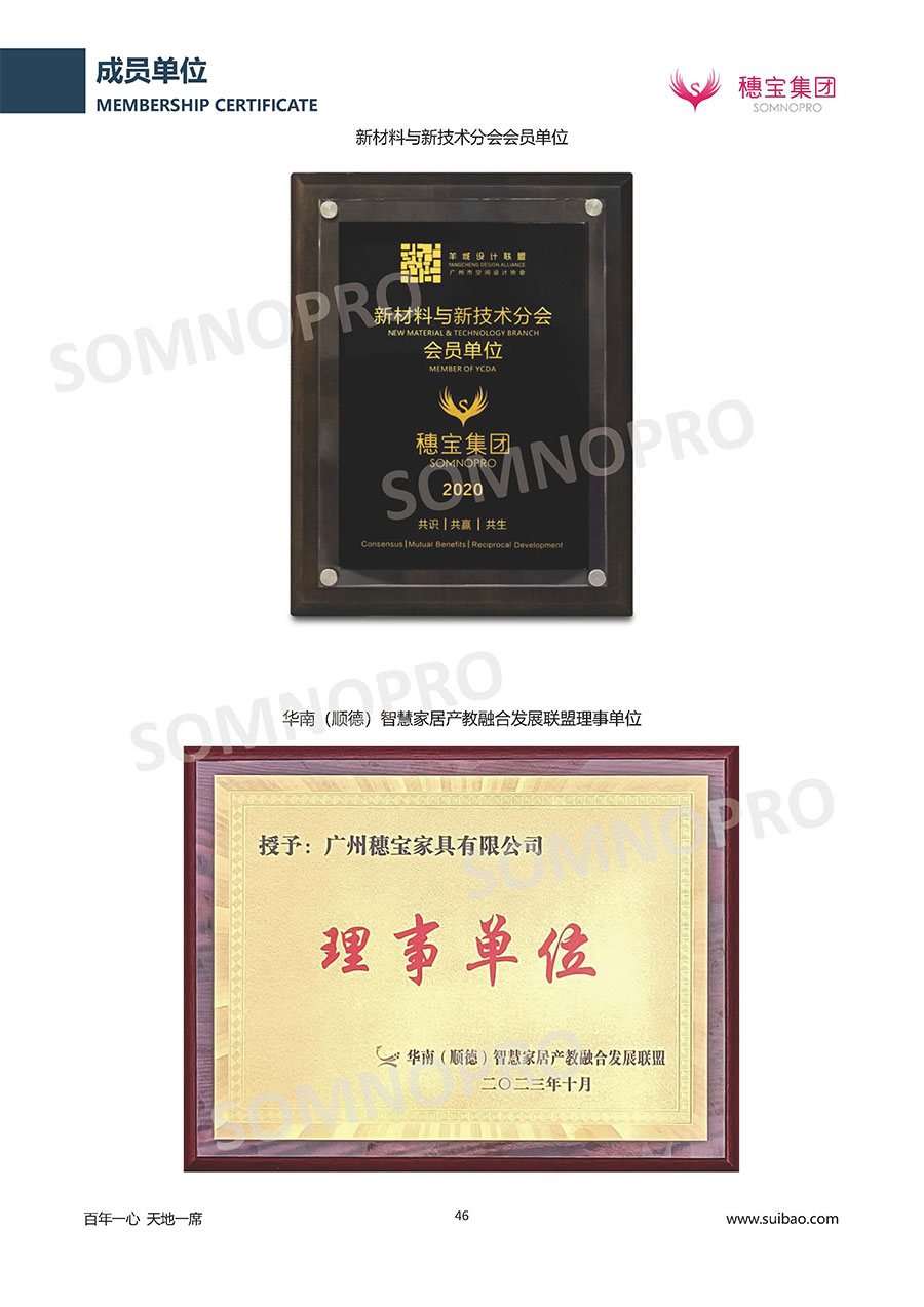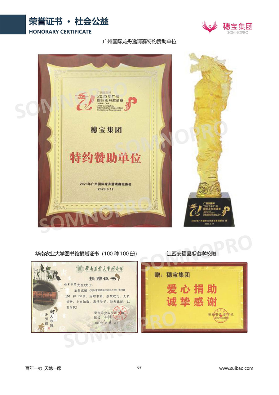 本著高品質(zhì)、高效率、重管理的原則,穗寶已通過ISO9001質(zhì)量管理體系認(rèn)證證書、ISO14001環(huán)境管理體系認(rèn)證證書、ISO45001職業(yè)健康安全管理體系認(rèn)證證書、中國(guó)環(huán)境標(biāo)志產(chǎn)品認(rèn)證證書、家居綠色環(huán)保領(lǐng)跑品牌、綠色正品家居品牌、企業(yè)標(biāo)準(zhǔn)“綠色領(lǐng)跑者”證書、CMS測(cè)量管理體系證書、CMS測(cè)量管理體系證書附件、廣東省“守信用重合同”企業(yè)、廣州歐亞-納稅信用A級(jí)納稅人(連續(xù)5年:2018-2022)、2024年中國(guó)500最具價(jià)值品牌,品牌價(jià)值高達(dá)302.89億元、廣東高價(jià)值商標(biāo)品牌(穗寶)、廣東省重點(diǎn)商標(biāo)保護(hù)名錄納入證明、廣州市勞動(dòng)關(guān)系和諧企業(yè)AA級(jí)。穗寶自創(chuàng)立以來,不斷致力于新產(chǎn)品的設(shè)計(jì)與研發(fā),多次在國(guó)內(nèi)家具展會(huì)屢獲獎(jiǎng)項(xiàng),產(chǎn)品暢銷國(guó)內(nèi)外,深受客戶一致好評(píng)。