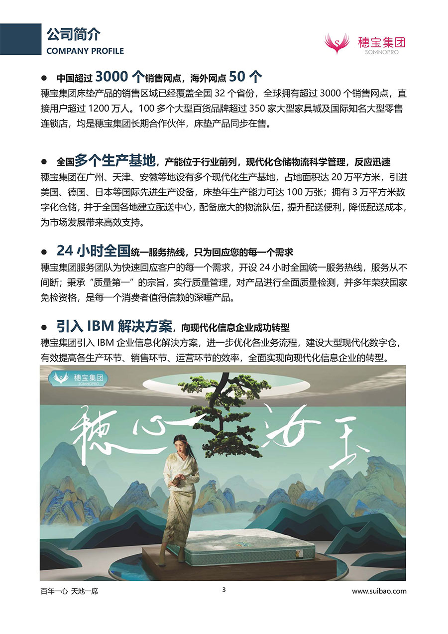 作為大家居行業(yè)的品質(zhì)倡導(dǎo)者,穗寶集團(tuán)不斷創(chuàng)新,豐富品牌實(shí)力,致力推動(dòng)中國(guó)床墊產(chǎn)業(yè)發(fā)展。至今,穗寶集團(tuán)旗下?lián)碛卸鄠€(gè)來自世界各地的優(yōu)質(zhì)品牌,包括:穗寶、詩(shī)貝艾爾、百納璐詩(shī)、睡客小鎮(zhèn)、Mr.Z早先生等;此外,穗寶集團(tuán)從世界各地甄選適合不同消費(fèi)者的優(yōu)質(zhì)睡眠產(chǎn)品,定制屬于您的睡眠空間。如今,穗寶集團(tuán)形成以研發(fā)、生產(chǎn)和銷售床墊為主營(yíng)業(yè)務(wù),涉及家具、家居裝飾、酒店配套等多項(xiàng)業(yè)務(wù)的企業(yè)群體。