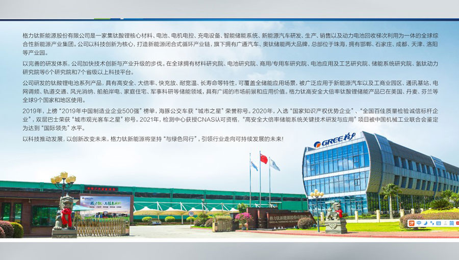 格力鈦新能源股份有限公司是一家集鈦酸鋰核心材料、電池、電機電控、充電設(shè)備、智能儲能系統(tǒng)、新能源汽車研發(fā)、生產(chǎn)、銷售以及動力電池回收梯次利用為一體的全球綜合性新能源產(chǎn)業(yè)集團。格力鈦以科技創(chuàng)新為核心,打造新能源閉合式循環(huán)產(chǎn)業(yè)鏈,旗下?lián)碛袕V通汽車、奧鈦儲能兩大品牌,總部位于珠海,擁有邯鄲、石家莊、成都、天津、洛陽、南京等產(chǎn)業(yè)園。