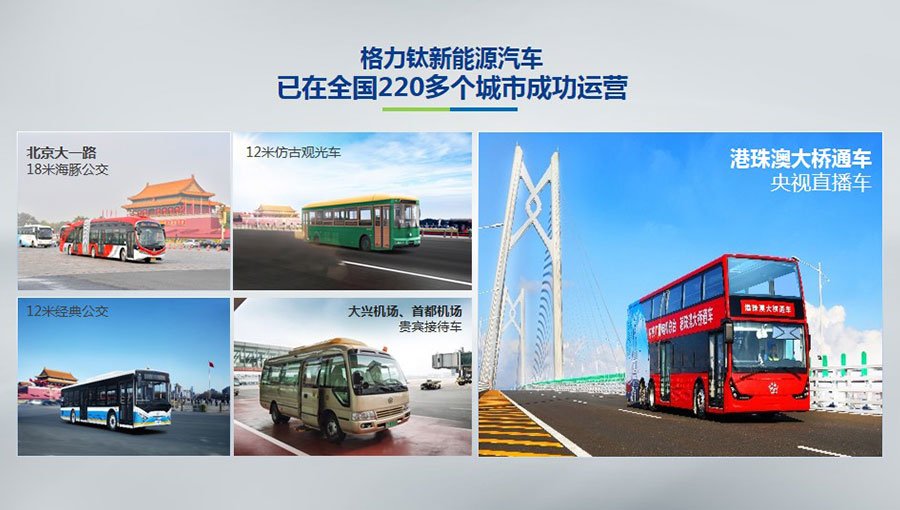 目前,格力鈦生產(chǎn)的新能源汽車于北京、杭州、武漢、青島、哈爾濱、包頭、??诘热珖?20多個城市運營。2014年,仿古鐺鐺車榮膺第22屆北京APEC會議官方指定用車、登陸北京環(huán)天安門旅游觀光線;2016年,雙層巴士榮膺第二屆中美低碳峰會指定用車、登陸國內(nèi)首條純電動雙層觀光車線路——北京城市旅游觀光3線;2017年,18米海豚公交車投入北京長安街1路運營;2018年,港珠澳大橋正式通車,雙層巴士擔綱中央廣播電視總臺直播車,成為首輛駛上港珠澳大橋的大巴車。