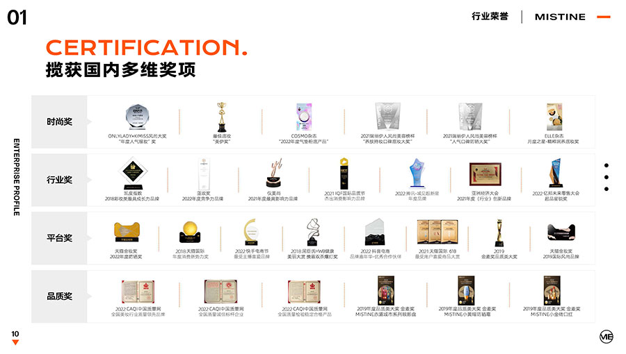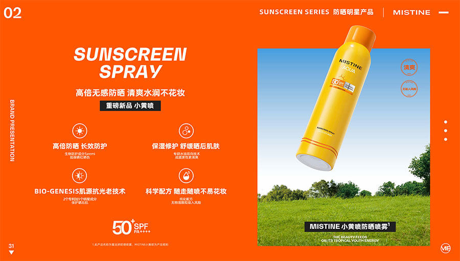 MISTINE蜜絲婷提出皮膚科學(xué)、前沿科技、靈魂成分、熱帶美學(xué)、卓越功效、保護(hù)環(huán)境六大品牌價(jià)值,致力于為全球女性提供豐富、安全、高品質(zhì)的美妝產(chǎn)品?;贛ISTINE蜜絲婷品牌首席科學(xué)顧問(wèn)——全球計(jì)算生物學(xué)權(quán)威之一、諾貝爾化學(xué)獎(jiǎng)得主Arieh Warshel的研究,MISTINE蜜絲婷創(chuàng)新防曬品類推出「光生物學(xué)」防曬系統(tǒng),提出“外層防護(hù)、中層修護(hù)和底層抗損”防曬新理念,引領(lǐng)防曬從“表面防護(hù)”進(jìn)入“深度抗光老”新時(shí)代。同時(shí),MISTINE蜜絲婷還持續(xù)深耕專業(yè)彩妝市場(chǎng),以熱帶美學(xué)基因造就產(chǎn)品防水防汗、高倍耐曬、長(zhǎng)效持妝的優(yōu)勢(shì),圍繞消費(fèi)者需求打造多元化的產(chǎn)品矩陣,引領(lǐng)防曬、底妝賽道發(fā)展。