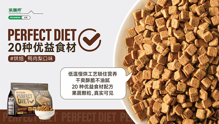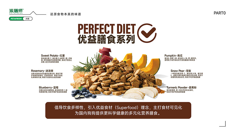 目前派膳師已擁有鮮食、零食、主糧等產(chǎn)品線,主打中高端主糧品類。全新(Perfect Diet)優(yōu)益膳食犬糧系列,倡導(dǎo)飲食多樣性,引入優(yōu)益食材(Superfood)理念,主打食材可見(jiàn)化,為國(guó)內(nèi)狗狗提供更科學(xué)健康的多元化營(yíng)養(yǎng)膳食。