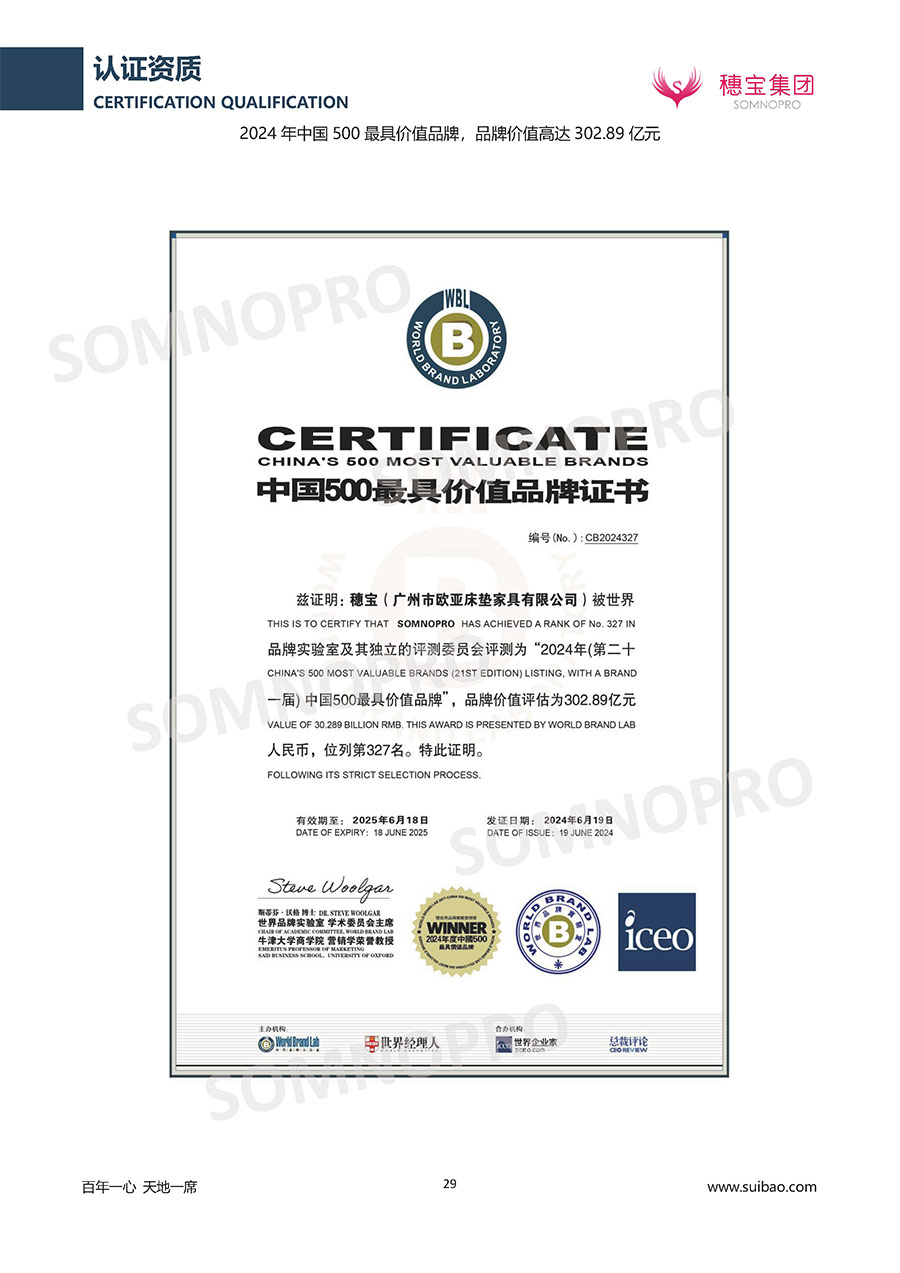 自1971年獨立研發(fā)生產(chǎn)出專屬國人的彈簧床墊,穗寶關(guān)于優(yōu)質(zhì)深度睡眠的研究已有半個世紀的歷史。穗寶一直專注床墊,專注中國消費者的睡眠研究,針對中國人特點進行優(yōu)化創(chuàng)新,不斷提升國人的睡眠體驗,只為成就每個晚上8小時的優(yōu)質(zhì)深度睡眠。憑借不斷革新的研發(fā)科技和深受消費者信賴的產(chǎn)品品質(zhì),穗寶集團旗下品牌和產(chǎn)品屢獲國內(nèi)外大獎,連續(xù)20年榮膺中國500最具價值品牌,品牌價值高達302.89億元。