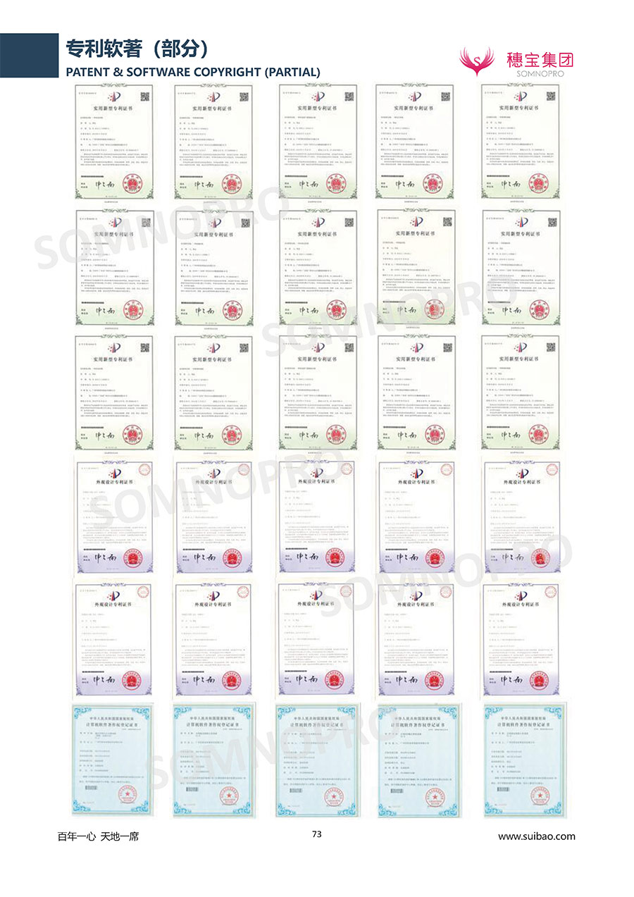 穗寶集團遍訪全球,深度整合世界優(yōu)質(zhì)資源,專注睡眠研究,與世界家具材料行業(yè)領(lǐng)導者禮恩派集團結(jié)成戰(zhàn)略伙伴,成立睡眠研究中心和彈簧網(wǎng)檢測中心,引入床墊鋪面耐久性測試儀,材料拉力測試儀,床墊撓度曲線測試儀,為產(chǎn)品注入優(yōu)秀基因;成功研發(fā)推出IFEEL深睡感知系統(tǒng)、X7研發(fā)系統(tǒng),關(guān)注消費者每一個細微的睡眠需求,致力于以科學的方式創(chuàng)造優(yōu)異的物理與心理助眠條件,幫助現(xiàn)代人獲得優(yōu)質(zhì)深度睡眠;不斷創(chuàng)新進取,軀位步技術(shù)、T-GUARD衡力支承系統(tǒng)等多項成果獲國內(nèi)國際專利。