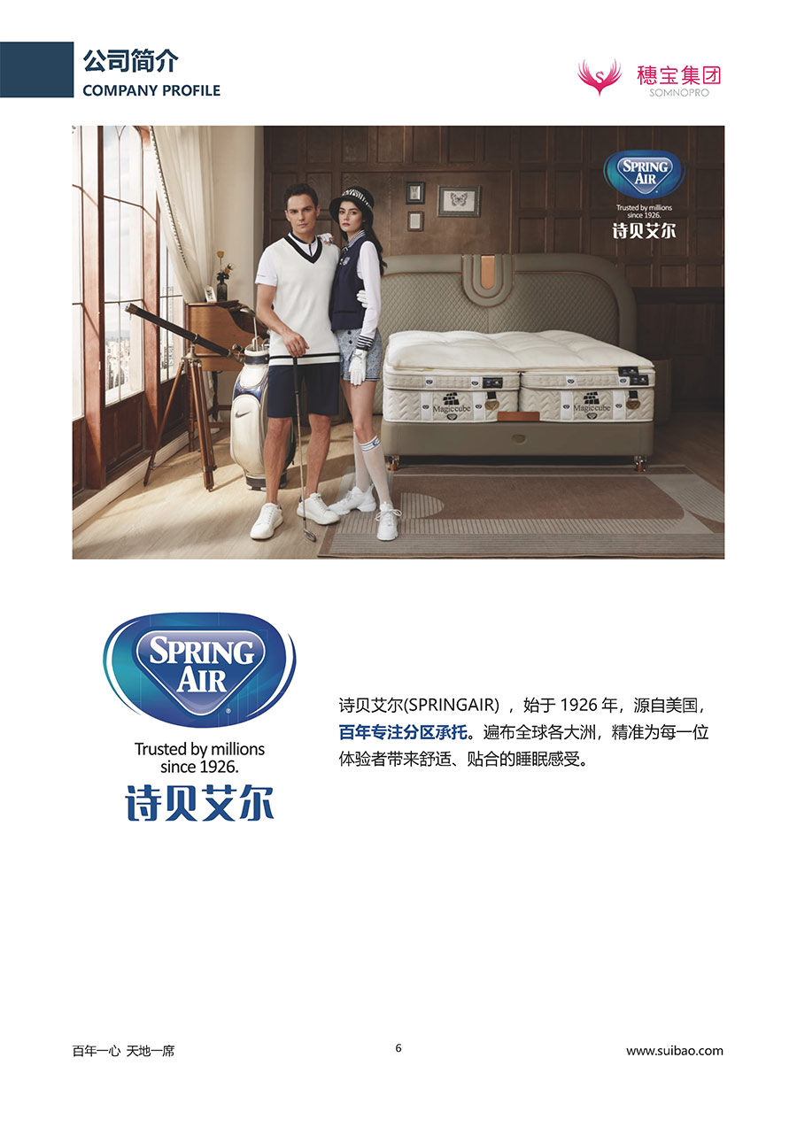 半個世紀的付出,穗寶集團在深度睡眠領(lǐng)域收獲非凡成就,贏得業(yè)界與社會的一致贊譽。作為大家居行業(yè)的品質(zhì)倡導者,穗寶集團不斷創(chuàng)新,豐富品牌實力,致力推動中國床墊產(chǎn)業(yè)發(fā)展。至今,穗寶集團旗下?lián)碛卸鄠€來自世界各地的優(yōu)質(zhì)品牌,包括:穗寶、詩貝艾爾、百納璐詩、睡客小鎮(zhèn)、Mr.Z早先生等;此外,穗寶集團從世界各地甄選適合不同消費者的優(yōu)質(zhì)睡眠產(chǎn)品,定制屬于您的睡眠空間。如今,穗寶集團形成以研發(fā)、生產(chǎn)和銷售床墊為主營業(yè)務,涉及家具、家居裝飾、酒店配套等多項業(yè)務的企業(yè)群體。