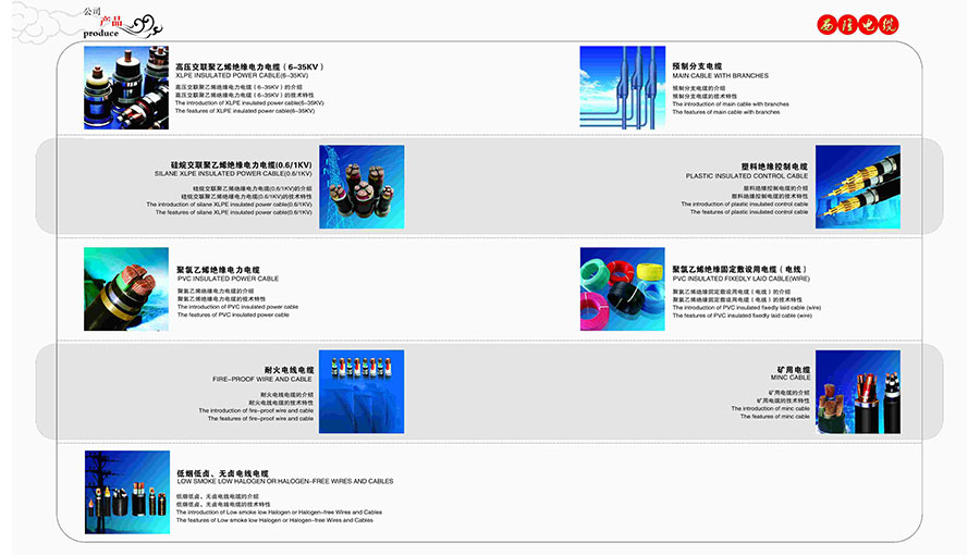 主要產(chǎn)品:“西隆線纜”品牌高低壓電力電纜、架空絕緣導線、架空裸導線、民用電線、戶外耐候線、控制電纜、橡套電纜、礦用阻燃電纜、硅橡膠電纜、計算機電纜、光伏專用電纜、鋁合金電力電纜、氟塑料電纜等產(chǎn)品