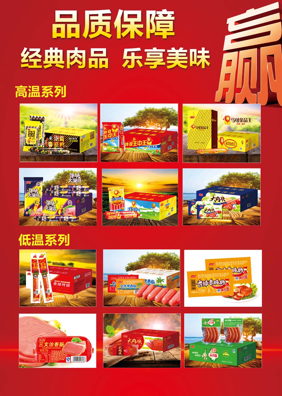 主要產(chǎn)品:江泉肉制品(熏煮香腸火腿制品、醬鹵肉制品)