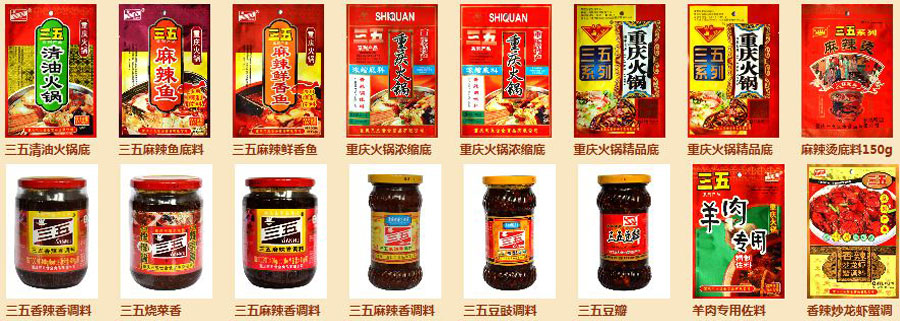 主要產品:“三五”牌、“世全”牌、“火成”牌、“三佳”牌火鍋佐料;“三五”牌火鍋調料