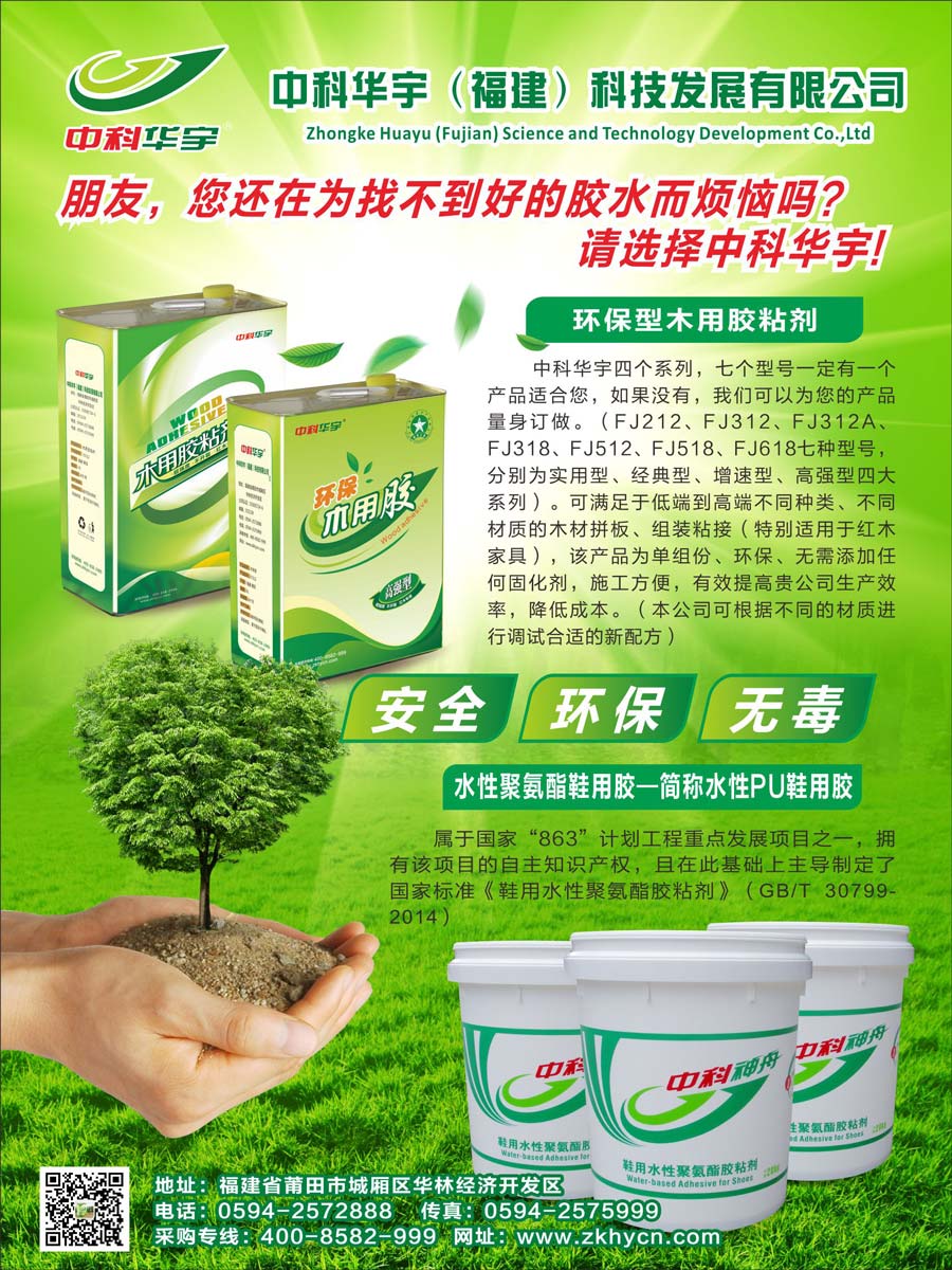 主要產(chǎn)品:中科華宇牌、中科神舟牌鞋用水性聚氨酯膠粘劑、環(huán)保型木用膠粘劑、晶瓷王、無(wú)苯無(wú)醛萬(wàn)能膠等膠粘劑產(chǎn)品