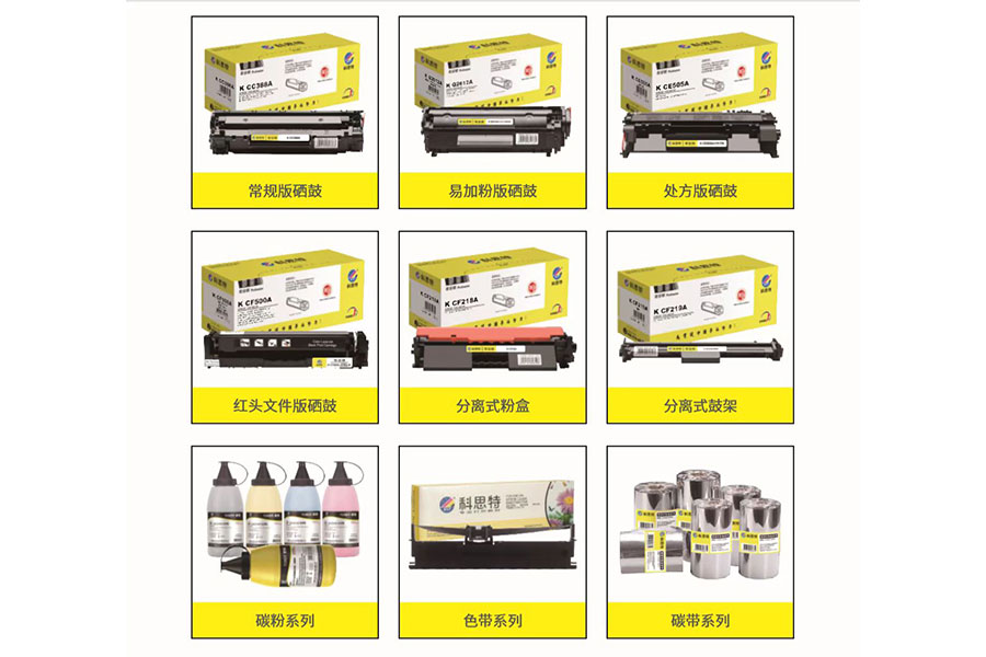 主要產(chǎn)品:科思特、勁彩、諾美佳、帝威、印友品牌硒鼓、墨盒、色帶、墨水、碳粉、粉盒、碳帶、配件等
