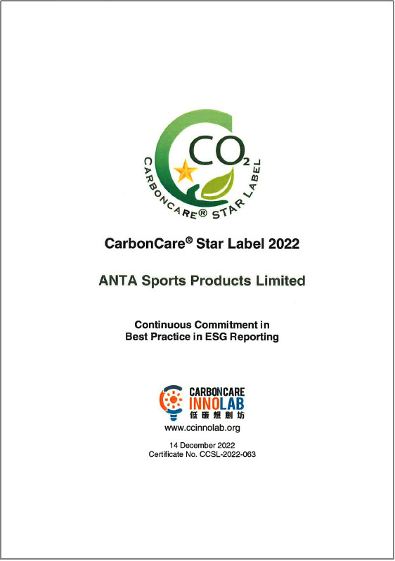 此外,安踏集團于低碳想創(chuàng)坊(Carbon Care Innovation Lab)中獲頒「ESG報告最佳匯報實踐第四級」,較去年提升兩級,反映集團ESG報告表現(xiàn)優(yōu)異,在公司董事局的問責度、實質性評估、社會關鍵績效指標的披露,以及企業(yè)氣候行動的努力亦得到外界的認可。安踏集團曾于過往連續(xù)三年成功取得「低碳關懷標簽」,因此本年度獲額外頒發(fā)「低碳關懷星級標簽」,以表彰過往在ESG方面的成果。
