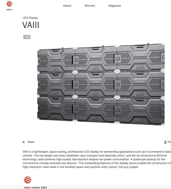 近日,2023年德國(guó)紅點(diǎn)設(shè)計(jì)大獎(jiǎng)名單公布。聯(lián)建光電VAIII系列微間距顯示屏、Pilot Pro系列租賃顯示屏、BIM Plus-X系列室內(nèi)商業(yè)顯示屏三款產(chǎn)品同時(shí)斬獲素有設(shè)計(jì)界“奧斯卡”之稱的紅點(diǎn)設(shè)計(jì)獎(jiǎng),這三款產(chǎn)品凝聚著全球前沿技術(shù)和創(chuàng)新設(shè)計(jì),實(shí)至名歸。據(jù)統(tǒng)計(jì),聯(lián)建光電是2023紅點(diǎn)獎(jiǎng)中獲獎(jiǎng)最多的LED顯示品牌。
