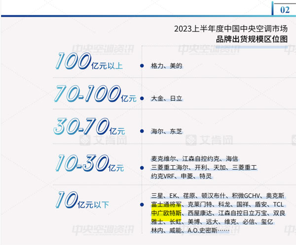 經(jīng)過(guò)多年的發(fā)展,中國(guó)中央空調(diào)市場(chǎng)的品牌格局基本穩(wěn)定。結(jié)合2023上半年各品牌的市場(chǎng)表現(xiàn),該報(bào)告將品牌出貨規(guī)模區(qū)位分為5大陣營(yíng),其中,中廣歐特斯在10億元以下規(guī)模榜上有名。