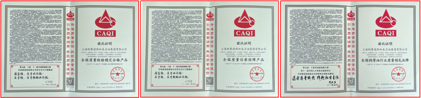 迎接即將到來的又一個全國質(zhì)量月——9月之際,8月11日,中國質(zhì)量協(xié)會向上海柯賽德斯加美石油集團(tuán)有限公司頒發(fā)三大榮譽(yù),即全國質(zhì)量檢驗(yàn)穩(wěn)定合格產(chǎn)品、全國質(zhì)量信譽(yù)保障產(chǎn)品、全國潤滑油行業(yè)質(zhì)量領(lǐng)先品牌。這是在新的市場形勢下,柯賽德斯加美石油集團(tuán)深耕能源,堅(jiān)持質(zhì)量振興企業(yè)、科技助推發(fā)展、誠信塑造品牌戰(zhàn)略的長期努力結(jié)出的碩果。