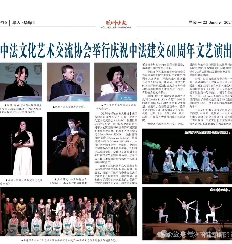 1月27日是中法建交60周年紀(jì)念日,日前由中法文化藝術(shù)交流協(xié)會(huì)(AEAFC)主辦的慶祝中法建交60周年文藝演出在巴黎6區(qū)政府禮堂舉行。巴黎6區(qū)政府、中國(guó)駐法使館等相關(guān)政府工作人員、歐洲時(shí)報(bào)、全球公益聯(lián)盟等組織負(fù)責(zé)人等出席活動(dòng),共話新時(shí)期大國(guó)友誼的現(xiàn)實(shí)意義及長(zhǎng)遠(yuǎn)影響。60周年、巴黎6區(qū),也寄寓著對(duì)中法交往六六大順的期盼。