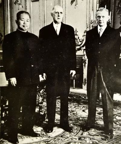 左為中國(guó)首任駐法大使黃鎮(zhèn),中為時(shí)任法國(guó)總統(tǒng)戴高樂將軍。
