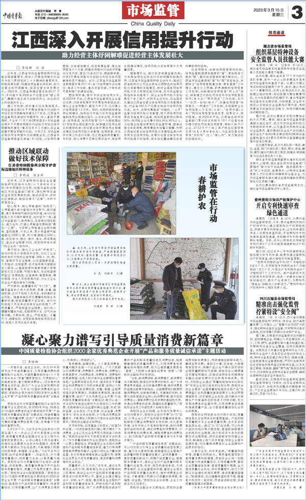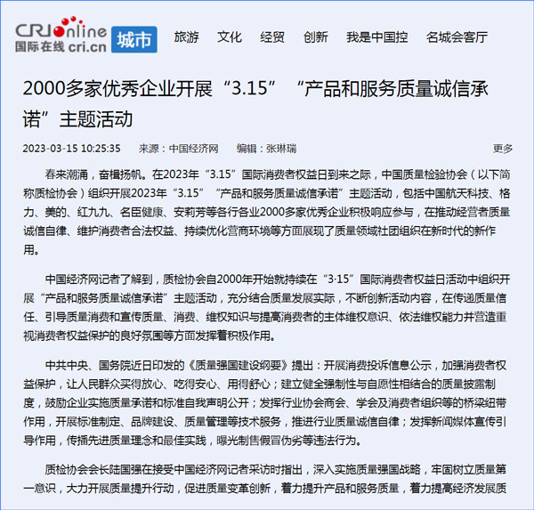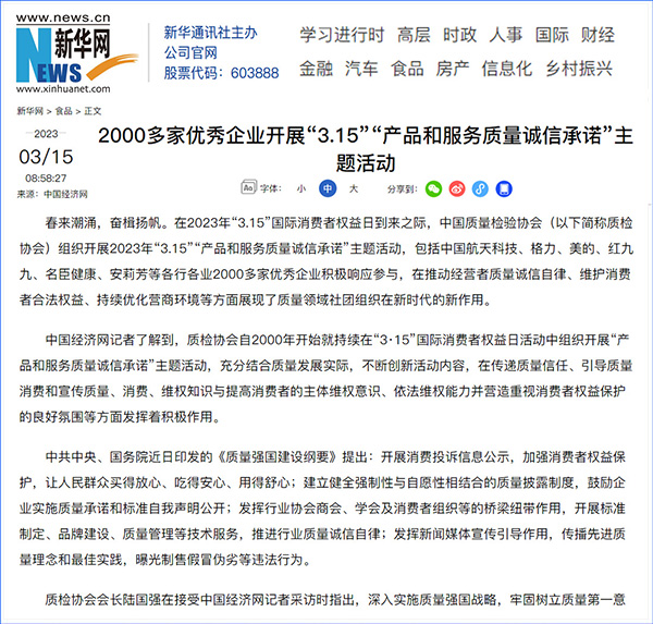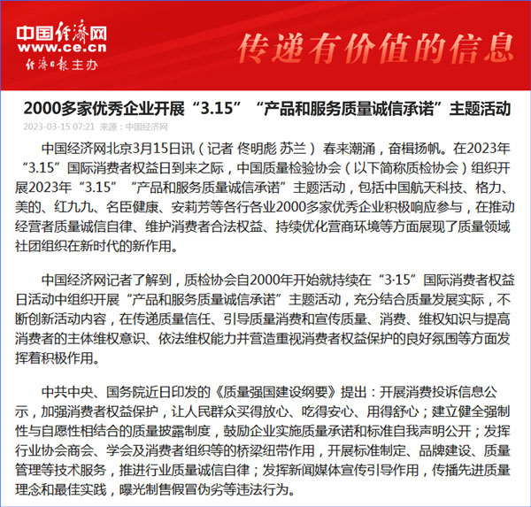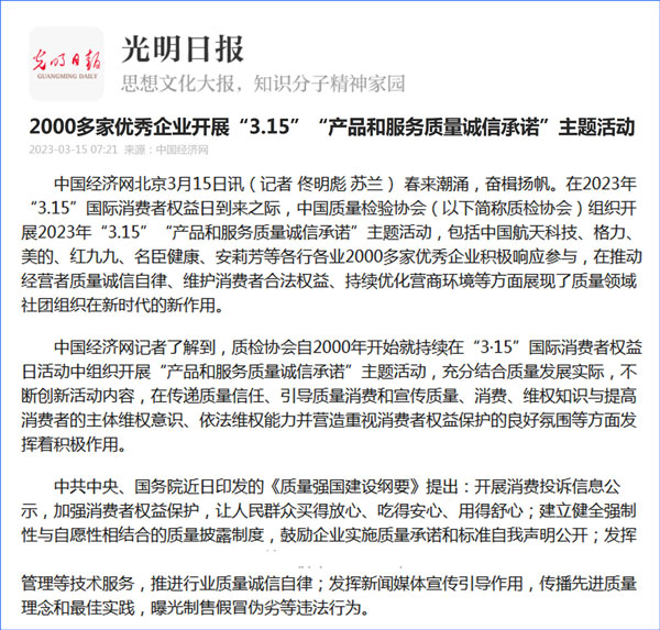 中國質(zhì)量報:凝心聚力譜寫引導(dǎo)質(zhì)量消費新篇章——中國質(zhì)檢協(xié)會組織兩千多家企業(yè)開展“產(chǎn)品和服務(wù)質(zhì)量誠信承諾”主題活動