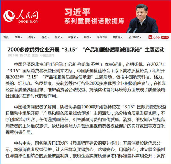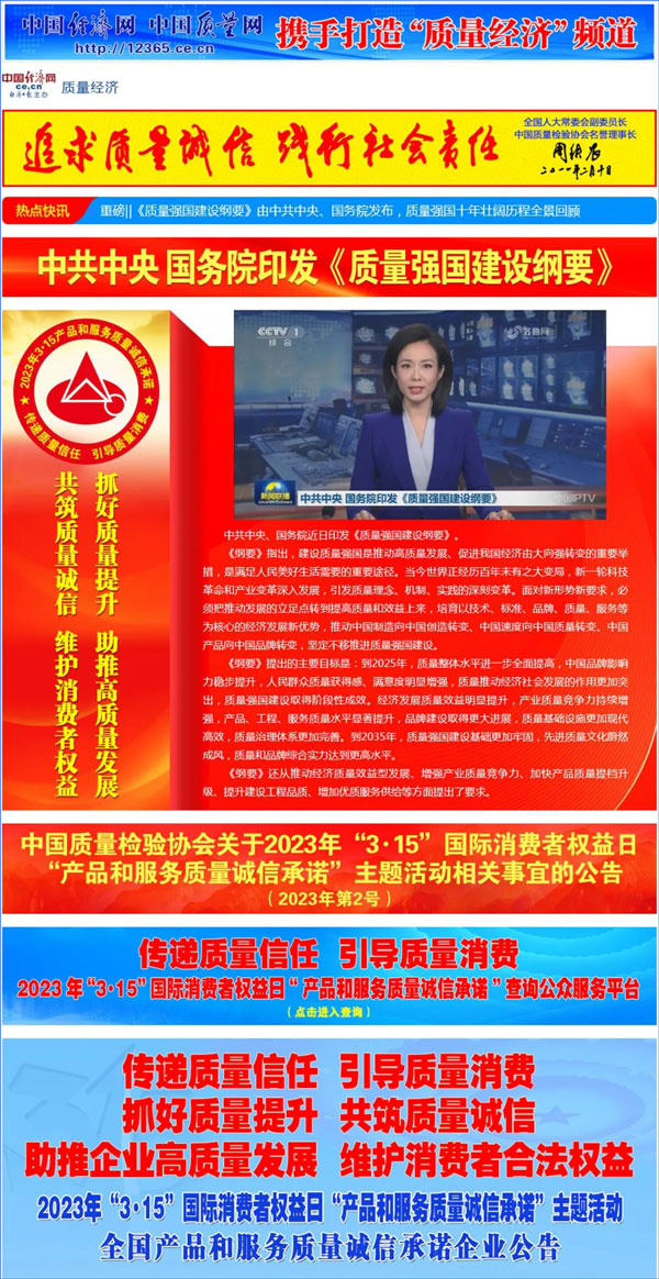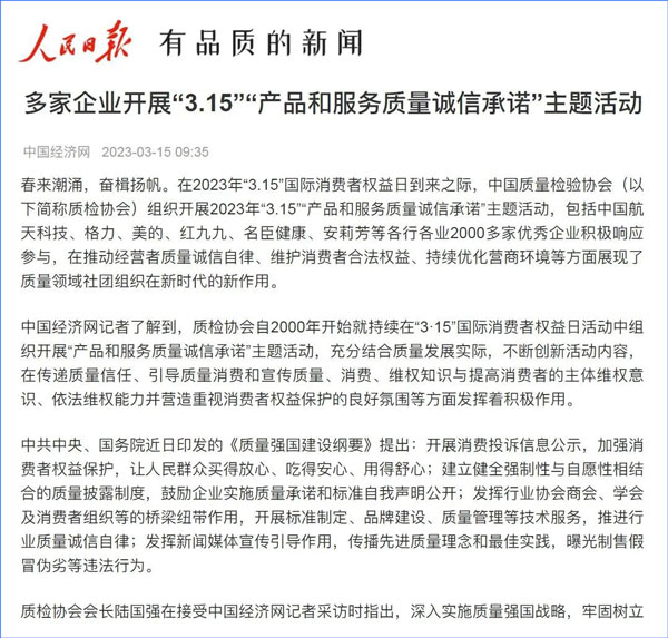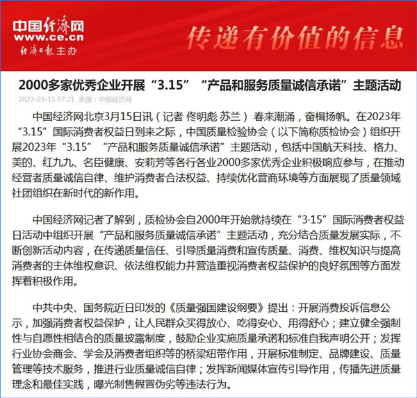 中國經(jīng)濟(jì)網(wǎng):2000多家優(yōu)秀企業(yè)開展“3·15”“產(chǎn)品和服務(wù)質(zhì)量誠信承諾”主題活動