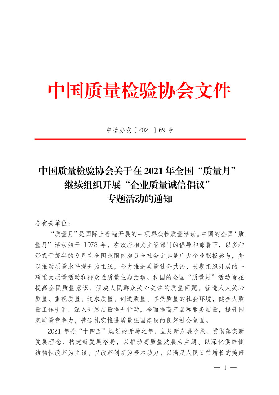 中國質(zhì)量檢驗協(xié)會關(guān)于在2021年全國“質(zhì)量月”