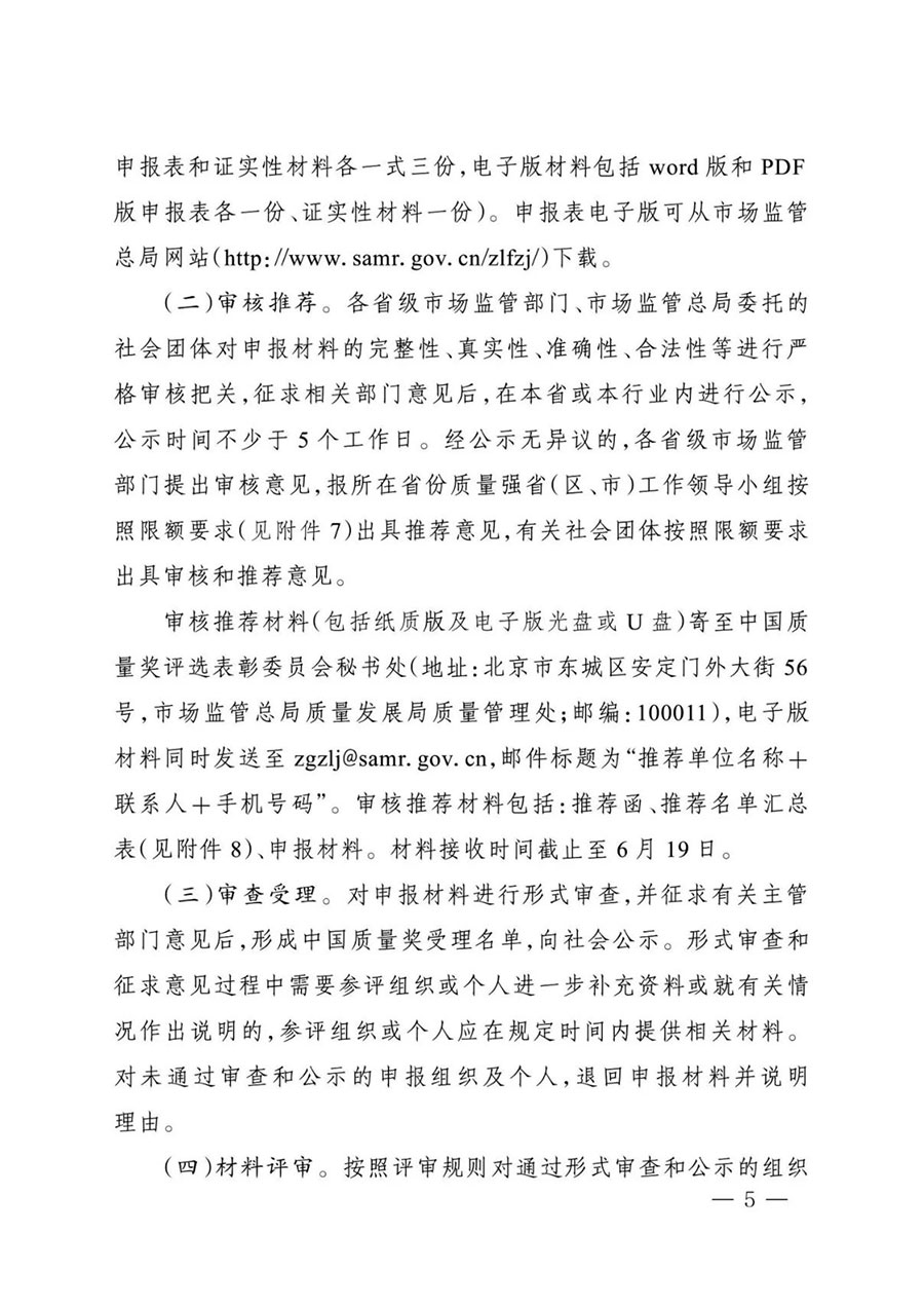 審核推薦材料(包括紙質(zhì)版及電子版光盤或U盤)寄至中國質(zhì)量獎評選表彰委員會秘書處(地址:北京市東城區(qū)安定門外大街56號,市場監(jiān)管總局質(zhì)量發(fā)展局質(zhì)量管理處;郵編:100011),電子版材料同時發(fā)送至zgzlj@samr.gov.cn,郵件標(biāo)題為“推薦單位名稱+聯(lián)系人+手機號碼”。審核推薦材料包括:推薦函、推薦名單匯總表(見附件8)、申報材料。材料接收時間截止至6月19日。