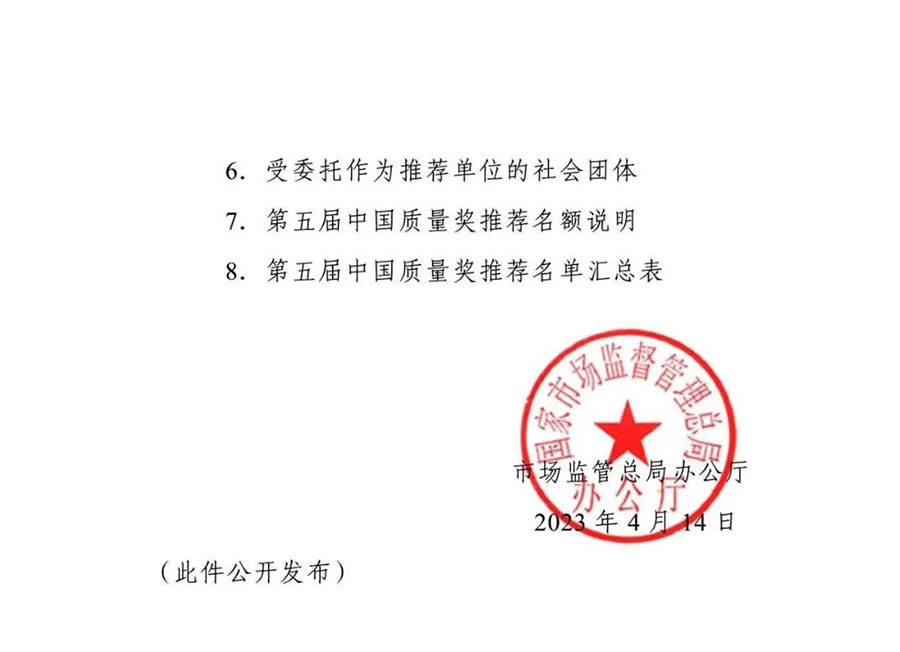 為全面貫徹黨的二十大精神,落實《質(zhì)量強國建設(shè)綱要》部署,根據(jù)中央批準(zhǔn)設(shè)立中國質(zhì)量獎有關(guān)要求和《中國質(zhì)量獎管理辦法》規(guī)定,市場監(jiān)管總局決定組織開展第五屆中國質(zhì)量獎評選表彰工作?,F(xiàn)將有關(guān)事項通知如下: