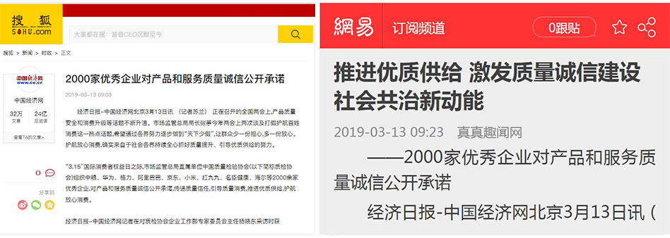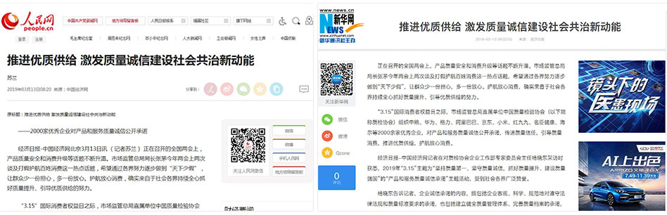 •中國經(jīng)濟網(wǎng)《推進優(yōu)質供給 激發(fā)質量誠信建設社會共治新動能 2000家優(yōu)秀企業(yè)對產(chǎn)品和服務質量誠信公開承諾》