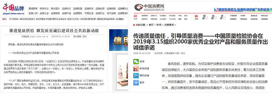 •中國消費網(wǎng)《傳遞質量信任,引導質量消費——中國質量檢驗協(xié)會在2019年3.15組織2000家優(yōu)秀企業(yè)對產(chǎn)品和服務質量作出誠信承諾》