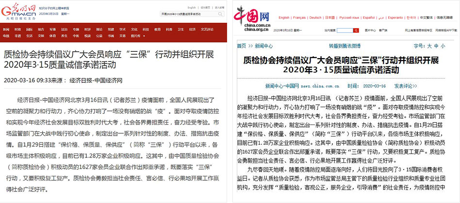 中國(guó)經(jīng)濟(jì)網(wǎng)《質(zhì)檢協(xié)會(huì)持續(xù)倡議廣大會(huì)員響應(yīng)“三保”行動(dòng)并組織開展2020年3·15質(zhì)量誠(chéng)信承諾活動(dòng)》