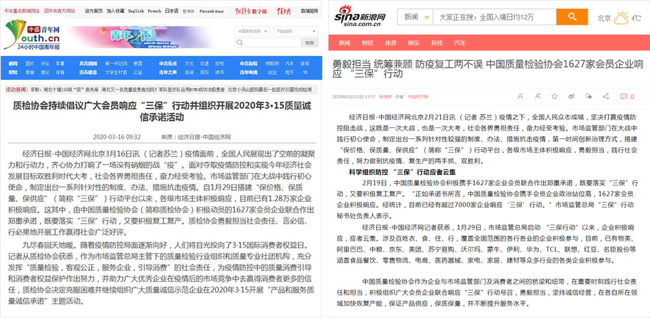 新浪網(wǎng)《勇毅擔(dān)當(dāng) 統(tǒng)籌兼顧 防疫復(fù)工兩不誤 中國(guó)質(zhì)量檢驗(yàn)協(xié)會(huì)1627家會(huì)員企業(yè)響應(yīng) “三?!毙袆?dòng)》