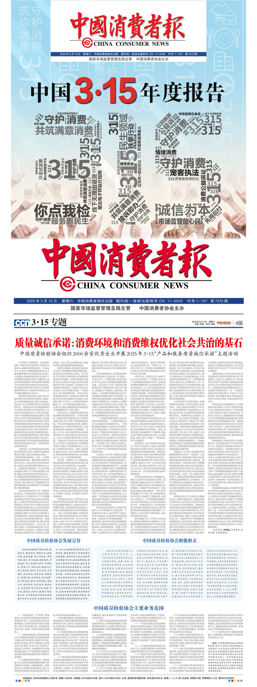 《中國消費(fèi)者報(bào)》(2025年3月15日刊)發(fā)布:質(zhì)量誠信承諾:消費(fèi)環(huán)境和消費(fèi)維權(quán)優(yōu)化社會共治的基石——中國質(zhì)量檢驗(yàn)協(xié)會組織2000余家優(yōu)秀企業(yè)開展2025年3·15“產(chǎn)品和服務(wù)質(zhì)量誠信承諾”主題活動