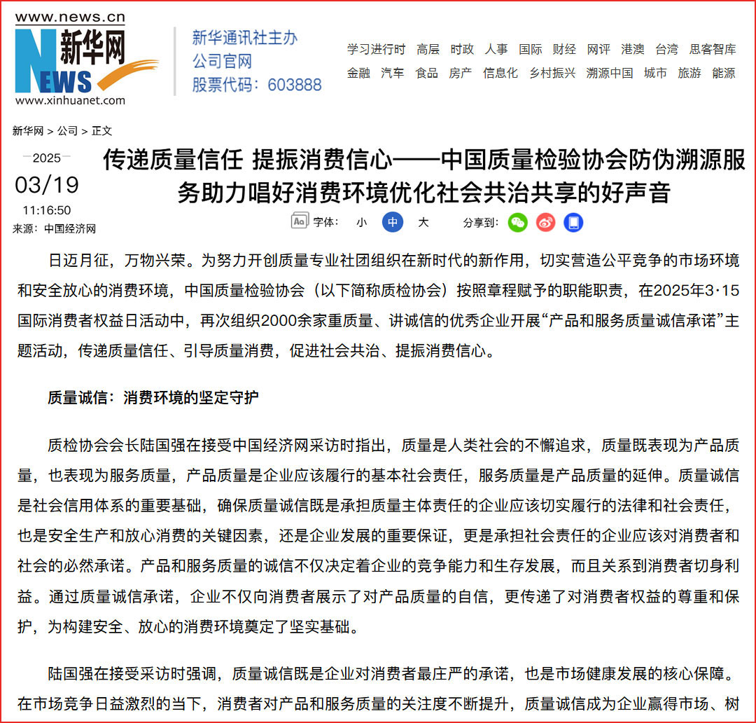 今日頭條報(bào)道:中國質(zhì)檢協(xié)會:推動防偽溯源服務(wù)賦能 優(yōu)化消費(fèi)環(huán)境提振消費(fèi)
