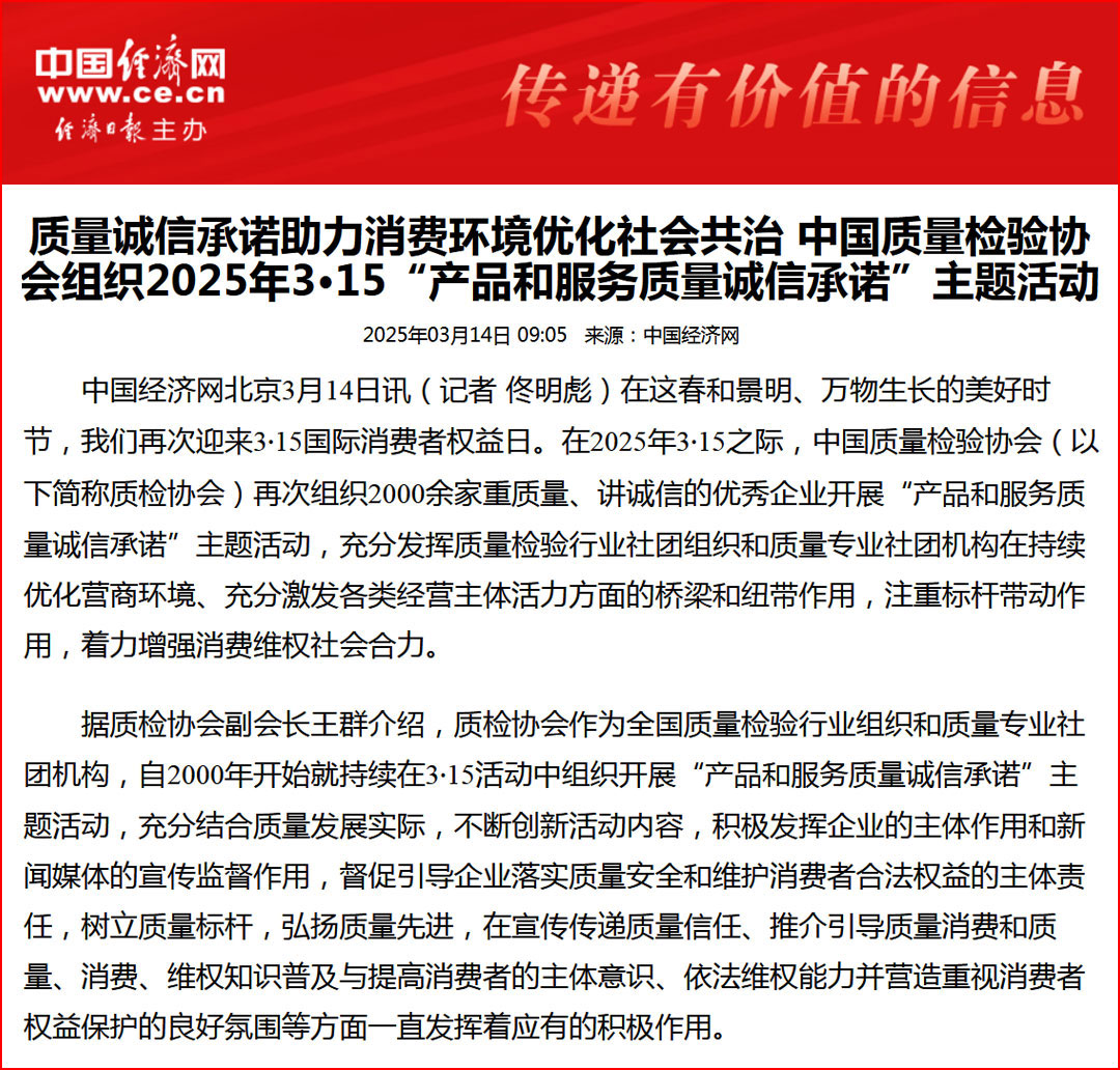 中國經(jīng)濟(jì)網(wǎng)“質(zhì)量經(jīng)濟(jì)頻道”發(fā)布:質(zhì)量誠信承諾:消費(fèi)環(huán)境和消費(fèi)維權(quán)優(yōu)化社會共治的基石——中國質(zhì)量檢驗(yàn)協(xié)會組織2000余家優(yōu)秀企業(yè)開展2025年3·15“產(chǎn)品和服務(wù)質(zhì)量誠信承諾”主題活動