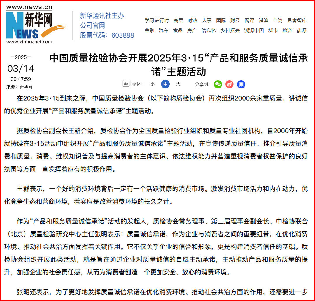 中國經(jīng)濟(jì)網(wǎng)“質(zhì)量經(jīng)濟(jì)頻道”發(fā)布:中國質(zhì)量檢驗(yàn)協(xié)會開展2025年3·15“產(chǎn)品和服務(wù)質(zhì)量誠信承諾”主題活動