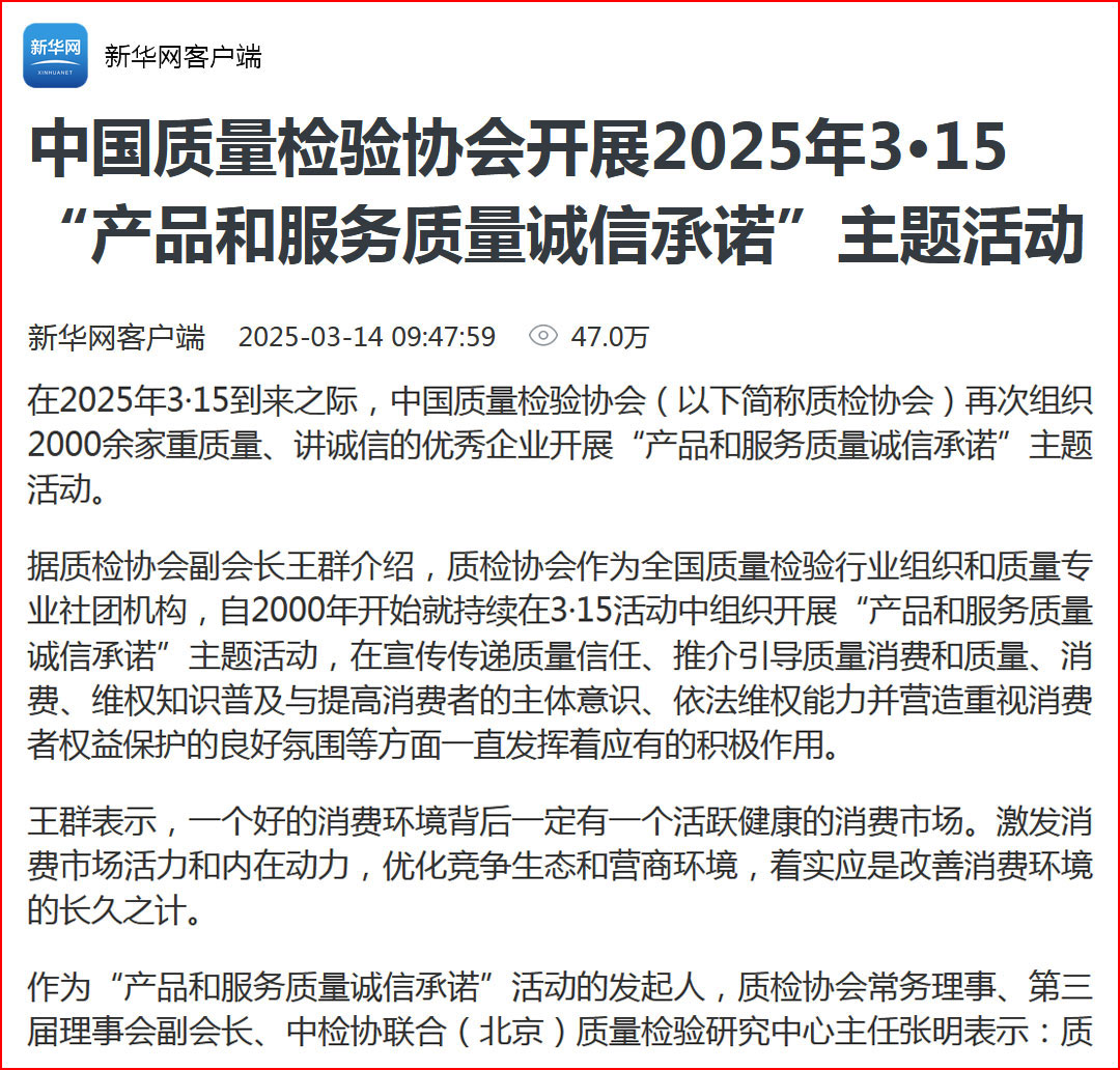 網(wǎng)易網(wǎng)報(bào)道:質(zhì)量誠信承諾助力消費(fèi)環(huán)境優(yōu)化社會共治——中國質(zhì)量檢驗(yàn)協(xié)會組織2025年3·15“產(chǎn)品和服務(wù)質(zhì)量誠信承諾”主題活動