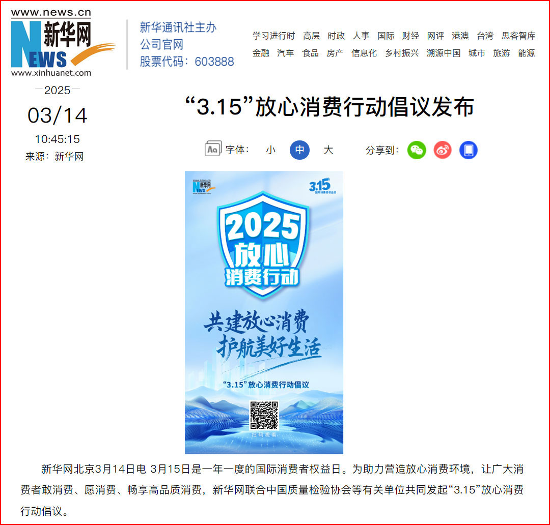 新華網(wǎng)北京3月14日電 3月15日是一年一度的國際消費(fèi)者權(quán)益日。為助力營造放心消費(fèi)環(huán)境,讓廣大消費(fèi)者敢消費(fèi)、愿消費(fèi)、暢享高品質(zhì)消費(fèi),新華網(wǎng)聯(lián)合中國質(zhì)量檢驗(yàn)協(xié)會等有關(guān)單位共同發(fā)起“3.15”放心消費(fèi)行動倡議。