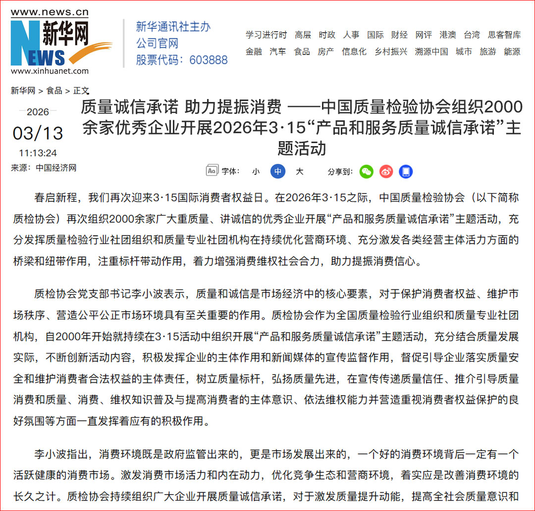 新華網(wǎng)客戶端報道:質(zhì)量誠信承諾 助力提振消費——中國質(zhì)量檢驗協(xié)會組織2000余家優(yōu)秀企業(yè)開展2026年3·15“產(chǎn)品和服務(wù)質(zhì)量誠信承諾”主題活動