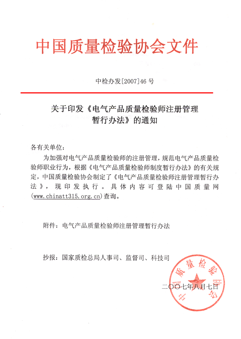 關(guān)于印發(fā)《電氣產(chǎn)品質(zhì)量檢驗(yàn)師注冊管理暫行辦法》的通知