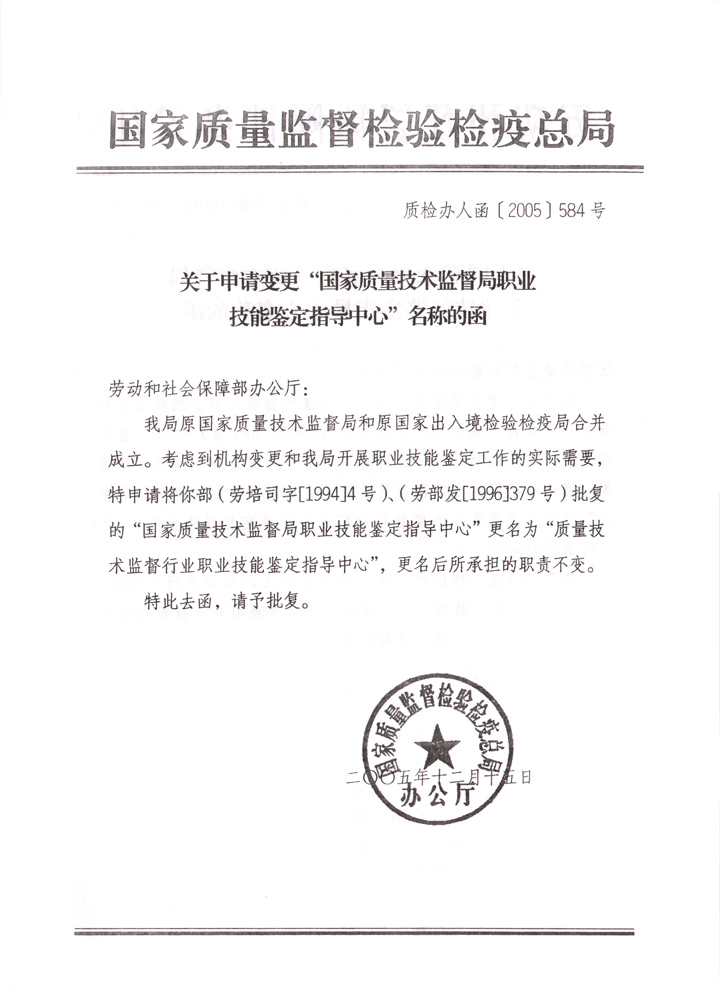 關于申請變更“國家質量技術監(jiān)督局職業(yè)技能鑒定指導中心”名稱的函