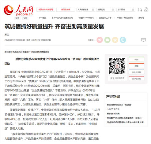 人民網:筑誠信抓好質量提升 齊奮進助高質量發(fā)展——質檢協會攜手2000家優(yōu)秀企業(yè)開展2020年全國“質量月”質量誠信倡議活動