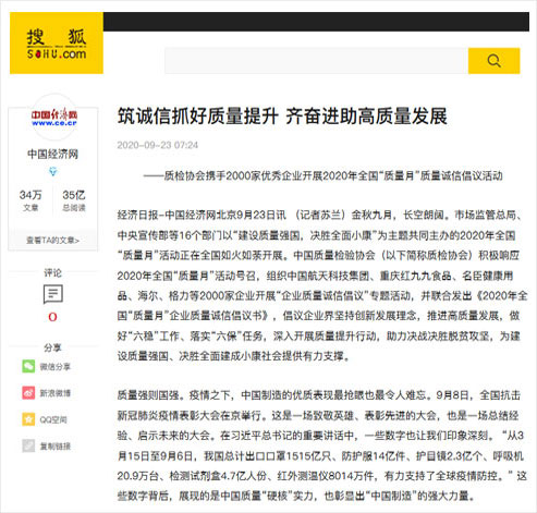 搜狐網:筑誠信抓好質量提升 齊奮進助高質量發(fā)展——質檢協會攜手2000家優(yōu)秀企業(yè)開展2020年全國“質量月”質量誠信倡議活動