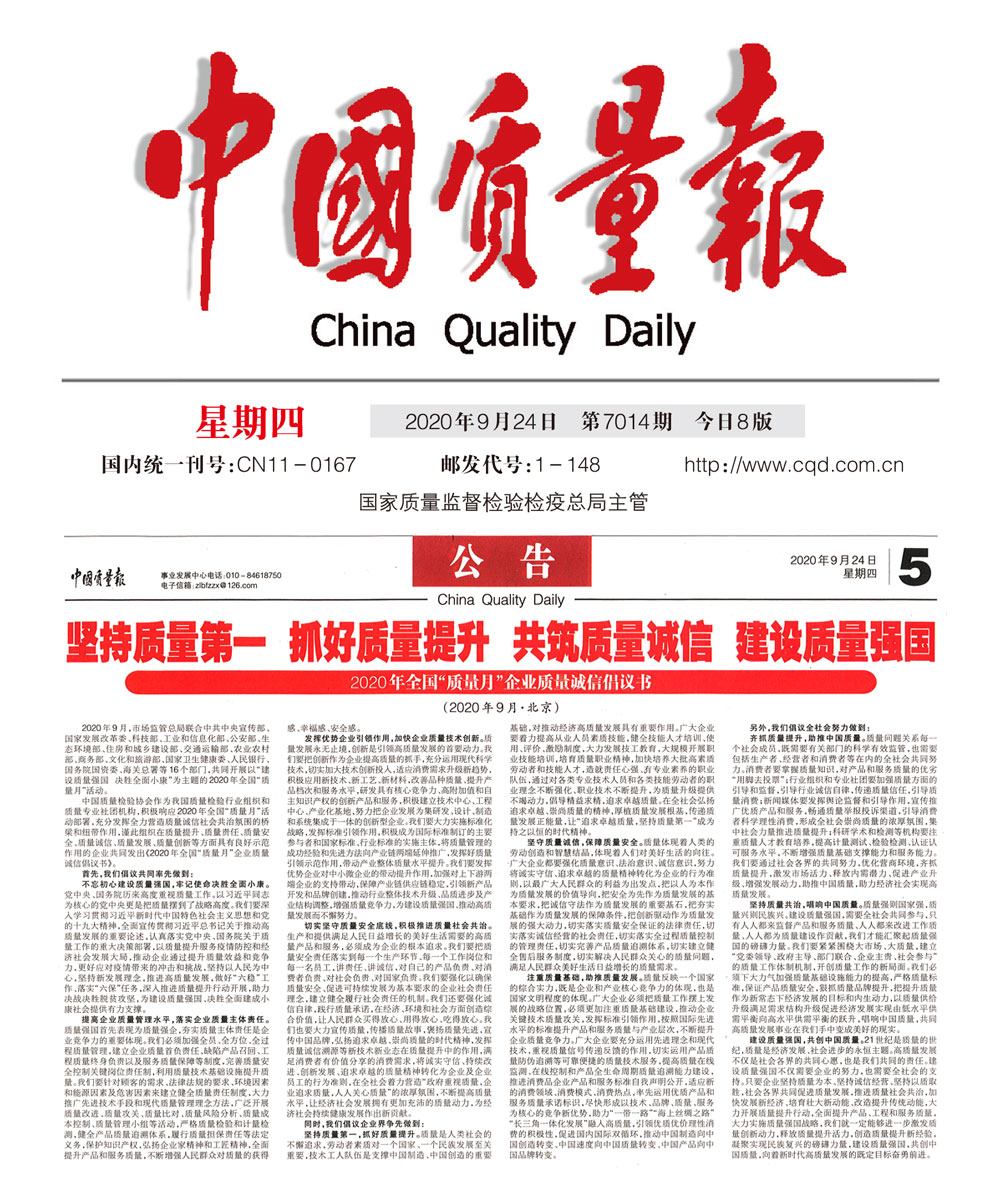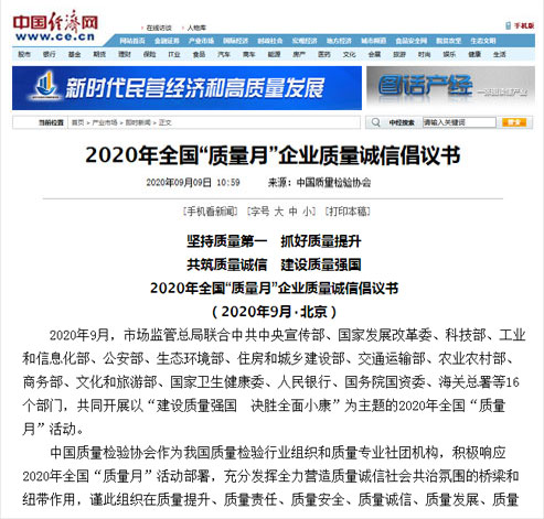 中國經濟網:堅持質量第一 抓好質量提升 共筑質量誠信 建設質量強國——2020年全國“質量月”企業(yè)質量誠信倡議書