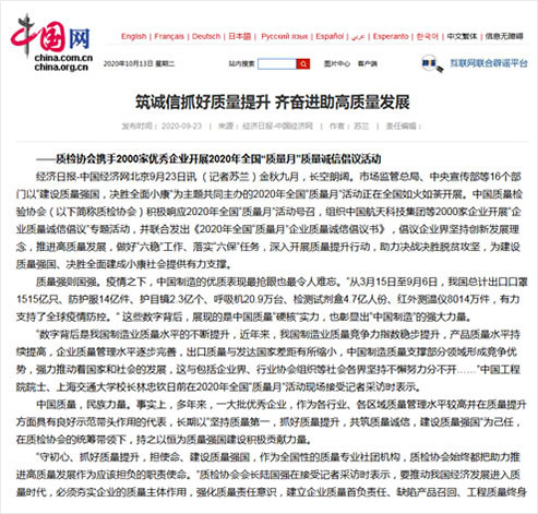 中國網:筑誠信抓好質量提升 齊奮進助高質量發(fā)展——質檢協會攜手2000家優(yōu)秀企業(yè)開展2020年全國“質量月”質量誠信倡議活動