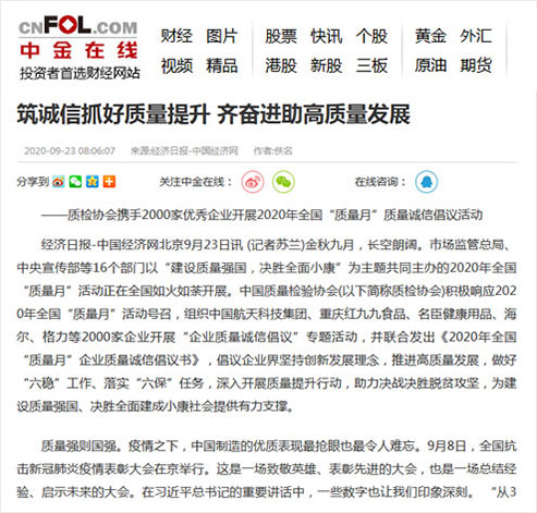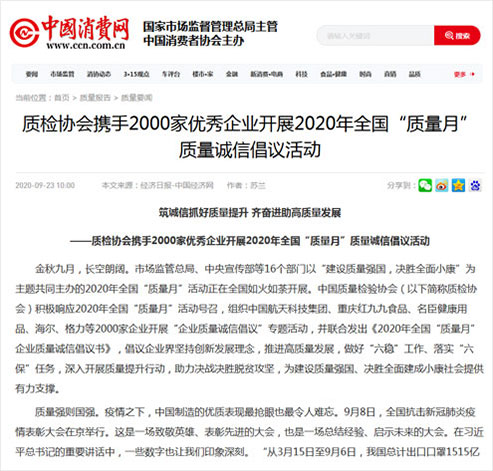 中國經濟網:筑誠信抓好質量提升 齊奮進助高質量發(fā)展——質檢協會攜手2000家優(yōu)秀企業(yè)開展2020年全國“質量月”質量誠信倡議活動