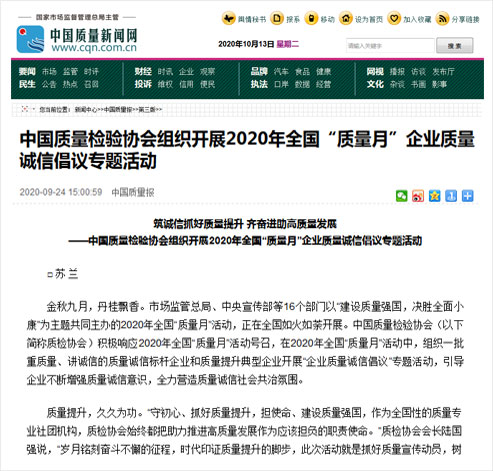中國質量新聞網:筑誠信抓好質量提升 齊奮進助高質量發(fā)展——中國質量檢驗協會組織開展2020年全國“質量月”企業(yè)質量誠信倡議專題活動