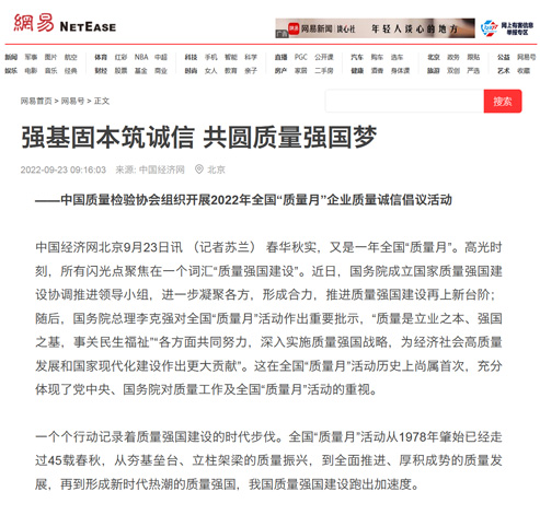 網(wǎng)易網(wǎng):強(qiáng)基固本筑誠信 共圓質(zhì)量強(qiáng)國夢(mèng)——中國質(zhì)量檢驗(yàn)協(xié)會(huì)組織開展2022年全國“質(zhì)量月”企業(yè)質(zhì)量誠信倡議活動(dòng)