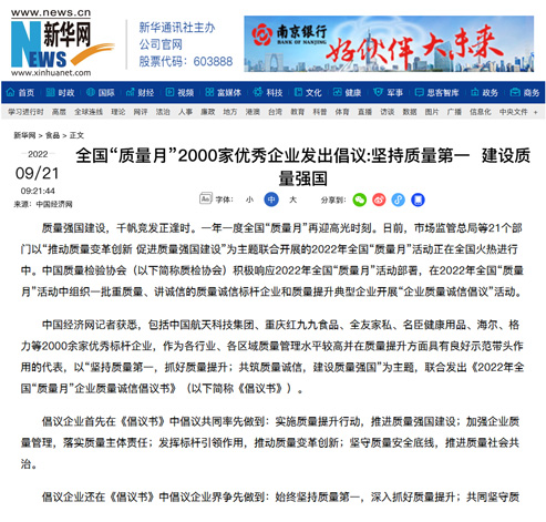 新華網(wǎng):全國“質(zhì)量月”2000家優(yōu)秀企業(yè)發(fā)出倡議:堅(jiān)持質(zhì)量第一 建設(shè)質(zhì)量強(qiáng)國
