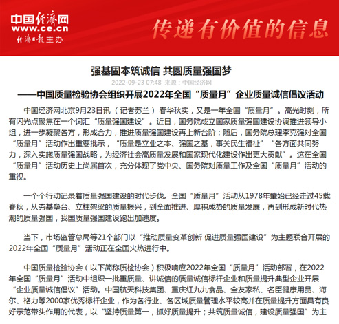 中國經(jīng)濟(jì)網(wǎng):抓好質(zhì)量提升 共筑質(zhì)量誠信 中國質(zhì)量檢驗(yàn)協(xié)會(huì)組織開展2022年全國“質(zhì)量月”企業(yè)質(zhì)量誠信倡議專題活動(dòng)